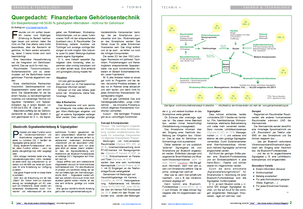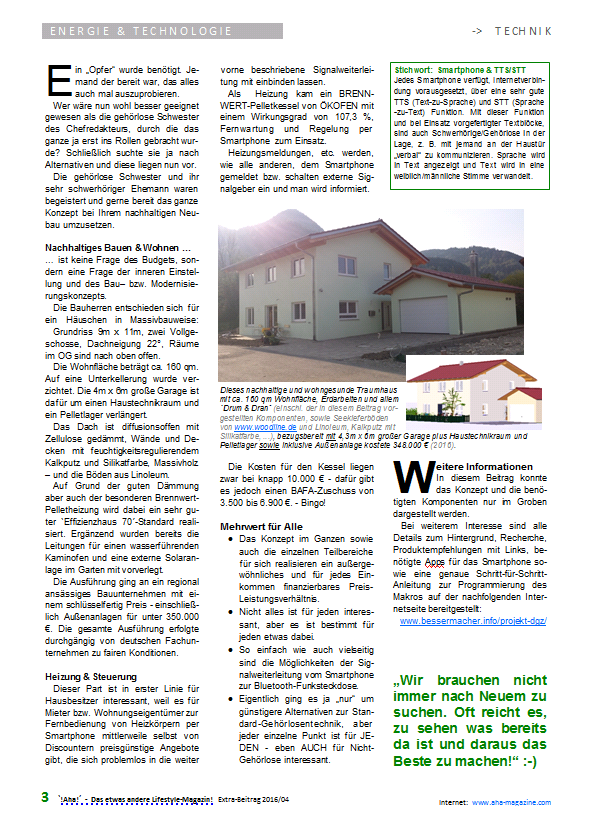 Zur `Bessermacher´- GESAMT-Übersicht Übersicht - Hintergrund - Konzept & Komponenten - Rauchmelder & Innenüberwachung, etc. - Außenüberwachung - Haustür - Heizung - Signalweiterleitung & Signalgeber - Smartphone-Einrichtung für Signalweiterleitung - Beispiel Die Story (Beitrag in der Deutschen Gehörlosenzeitung 2016) und weitere Resonanzen |
