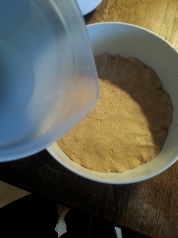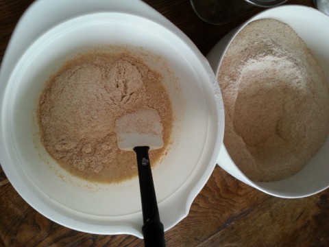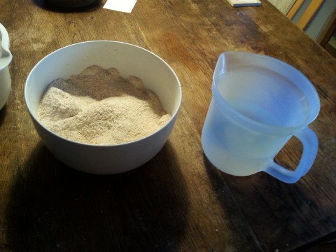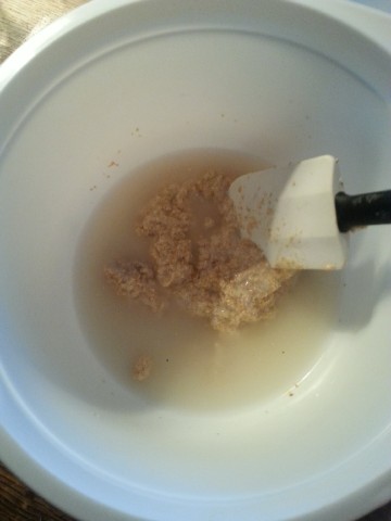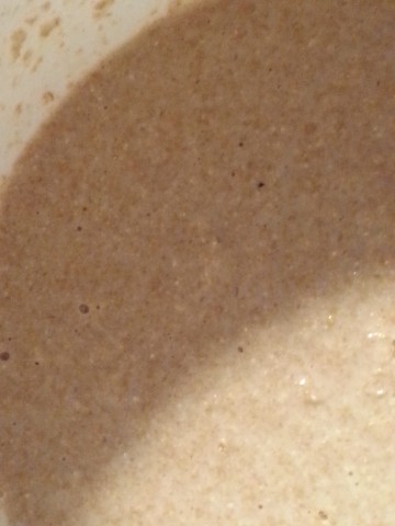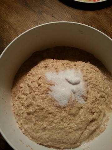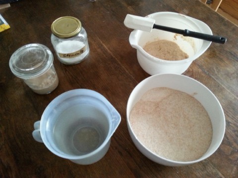 unseren Sauerteig-Ansatz ...![]() ... und dazu nochmal so viel warmes Wasser. |