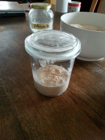 ![]() Wir sehen hier nun im Einmachglas unseren Sauerteig-Ansatz für das nächste Backen (-> Kühlschrank), Steinsalz, unseren gerade angesetzten Vorteig, lauwarmes (ca. 35° C) Wasser und frisch gemahlenes Vollkorn-Dinkel-Mehl. |
