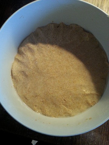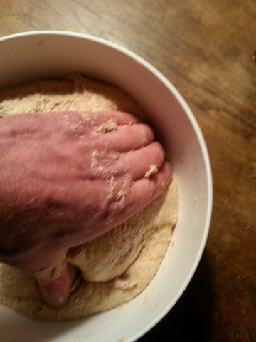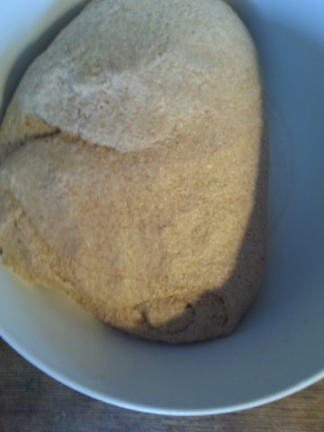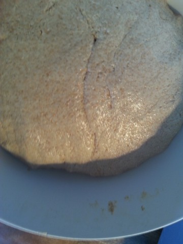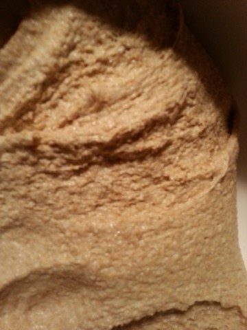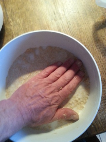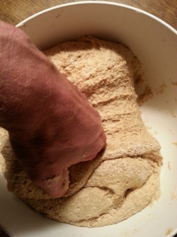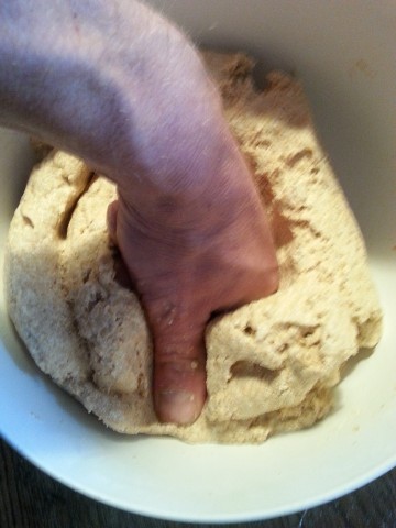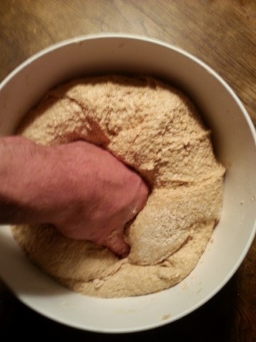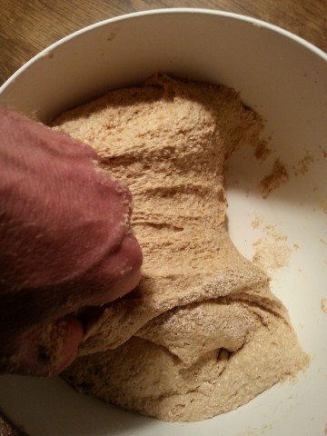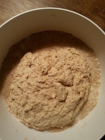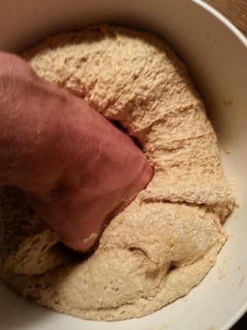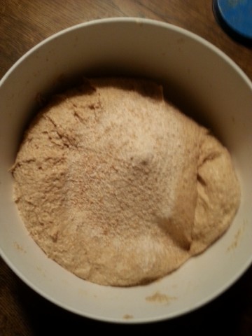 Der am Vortag noch recht "dünne" Teig ist nun recht zäh geworden, weil in diesem das Vollkornmehl weitere Flüssigkeit aufgenommen/gebunden hat. Falls der Teig doch noch etwas dünn ist, kann man jetzt noch etwas Mehl dazu geben. | |