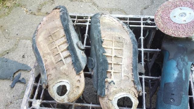 Für die meisten Sohlen reicht eine kleine Flex mit Schleifscheibe und 24er Körnung - damit bekommt man die ruckzuck weg.