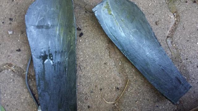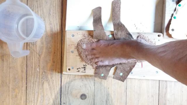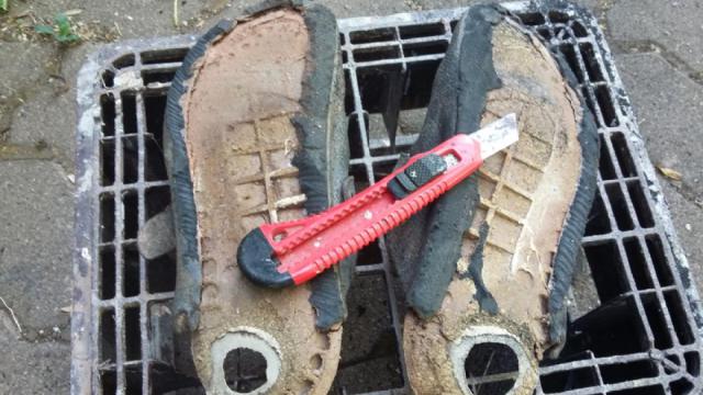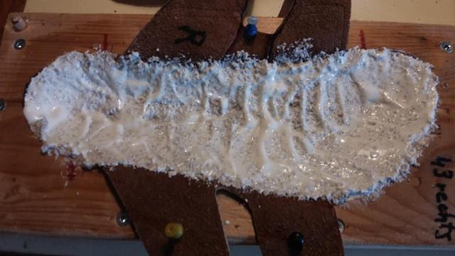 c) ... den Latex-Brei rundum die suboptimalen Teile der Sohle verspachteln und antrocknen lassen ...
