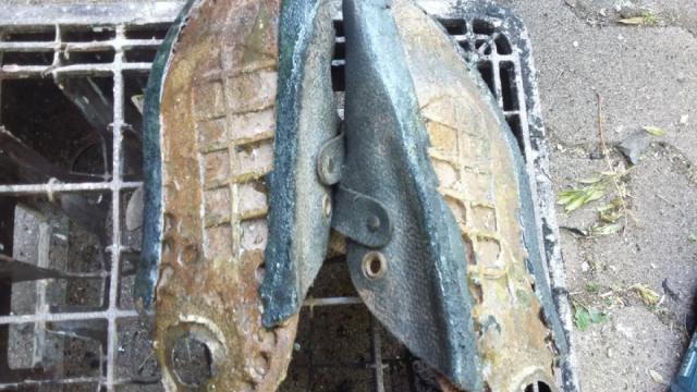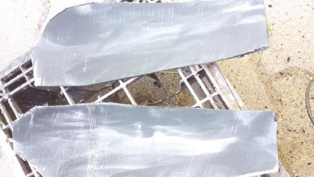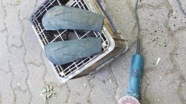 1. Großzüge Sohlen-Rechteck aus Motorradreifen mit kleiner Flex und Metalltrennscheibe rausschneiden: