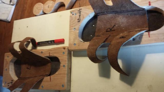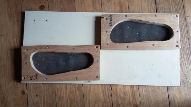 2. "Rähmen": Auf einem 30 mm dicken Brett die Sohlen-Umrisse beider Muster-Sandalen aufzeichnen. Dann mit Bohrmaschine/Akkuschrauber und Bohrer 8-10 mm innerhalb der Umrisse jeweils 1-2 Löcher bohren und den Umriss mit einer Stichsäge aussägen.