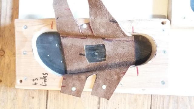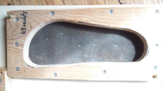 3. Fixierung der Sohlen: Da die Motorradreifen gewölbt sind, die spätere Sohle jedoch glatt sein sollte, werden nun die Rähmen wieder gelöst und die Motorradsohlen ZWISCHEN die Rähmen und dem "Unterbrett" gelegt und dann wieder die Rähmen aufgeschraubt - so dass die Sohlen zwischen Unterbrett und Rähmen richtig gut eingeklemmt und (fast) eben sind.