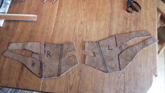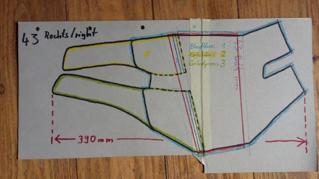 Beim Kopieren vom Schnitt ist mir ein Fehler unterlaufen, der mit dokumentiert ist - aber auch die Korrektur. Beim Kopieren habe ich die Dicke der Sohle vom Muster MIT aufgenommen statt abzuziehen. So wäre aber alles zu breit geworden, also musste ich den Bereich, der später mit der Sohle verklebt wurde um ca 12 mm schmälern bzw. die äußere Kontur entsprechend zurücksetzen.
