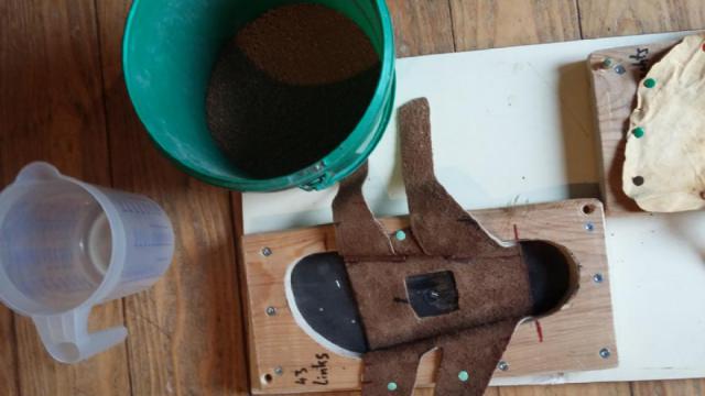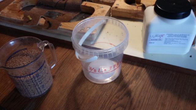 a) Als erstes feststellen, wieviel Material man für 1 Fußbett benötigt. Dazu 1 Form mit Kork-Brösel füllen und den Fuß so weit reindrücken, wie einen behagt. Alle nichtbenötigten Korkbrösel wegfegen und NUR die im Rahmen bzw. der Form verbliebenen Kork-Brösel in einen Messbecher geben, die Volumen-Menge notieren und ein 2. Gefäß mit derselben Menge an Korkbrösel befüllen (für das andere Fußbett).