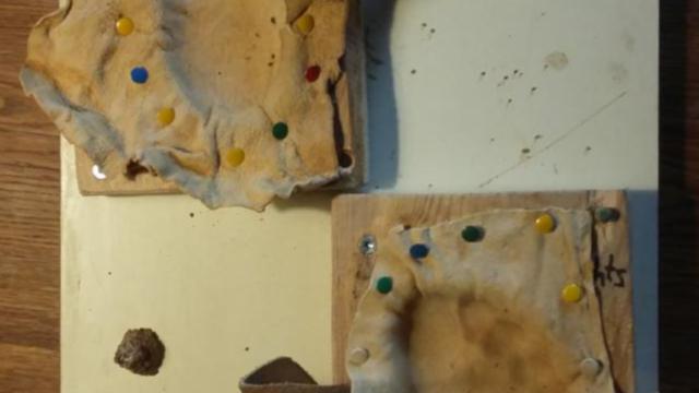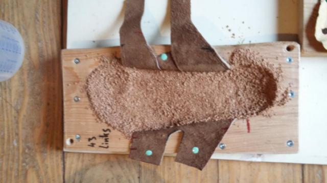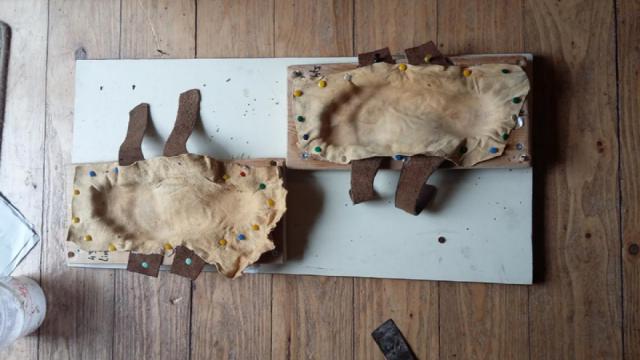f) Deckleder in die Latexmilch auf der Korkmasse legen (so das man fühlen kann, wie das Deckleder leicht feucht wird), Fuß eindrücken und an den Zehen etwas frei-drücken um für die Zehen später ein wenig Raum zu haben, Deckleder außenrum mit paar Reisnägel fixieren und nach ca. 5 Minuten den Fuß aus der Form nehmen.