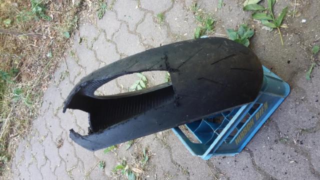 ... und nahm ganz einfach einen deutlich dünneren und damit wesentlich leichteren und vor allem sehr biegsameren MOTORRAD-Reifen.