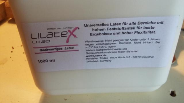 Ökologisch und dermatologisch geprüfte Latex-MILCH für die Maskenbildnerei von "www.LILATEX.de" (1 Liter "Lilatex Creativ Latex", dickflüssig, Artikelnummer: 16-1000-000 kosteten 2021 mit Versand rund 17 €).