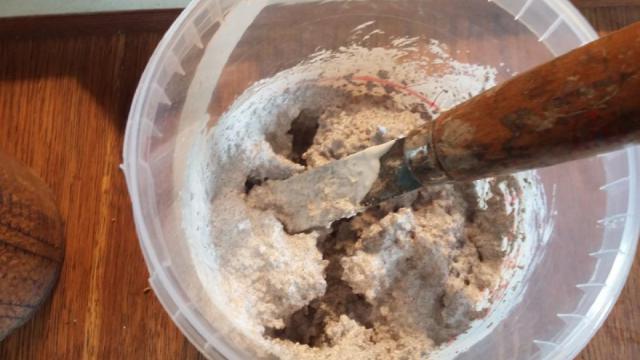 c) Kork-Brösel für 1 Sandale in eine Gefäß geben und Latexmilch hinzugeben, anmischen bis eine dünn-breiige Konsistenz erreicht ist die aber noch mit einem schmalen Spachtel verarbeitet werden kann.