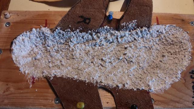 b) Die inneren Seitenränder der Formen/Rähmen unbedingt gut(!) mit Fett oder Öl (auch pflanzlich) einschmieren, damit die Kork-Latexmilch-Mischung NICHT mit dem Rand verklebt. Die Sohle MUSS sauber bleiben (ggf. mit Verdünnung reinigen).