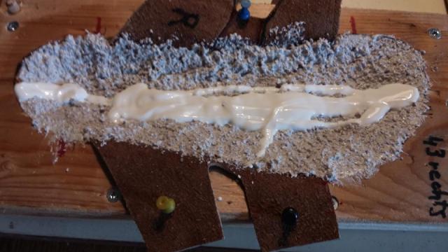 Überlaufenden bzw. überflüssigen Kork-Brei rundherum entfernen und nun unbedingt mindestens 36 Stunden, besser 48, an einem warmen und luftigen Ort trocknen bzw. abbinden lassen. In den ersten Minuten ist Ammoniak riechbar, der sich aber rasch verflüchtigt.