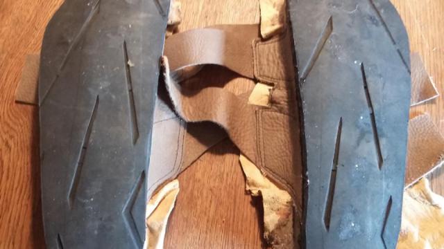 Wer es einfach mag, der kauft sich paar Sandalen/Schuhe und entfernt gleich die alte Sohle um eine Motorrad- oder Autoreifen-Sohle von Anfang an aufzukleben.