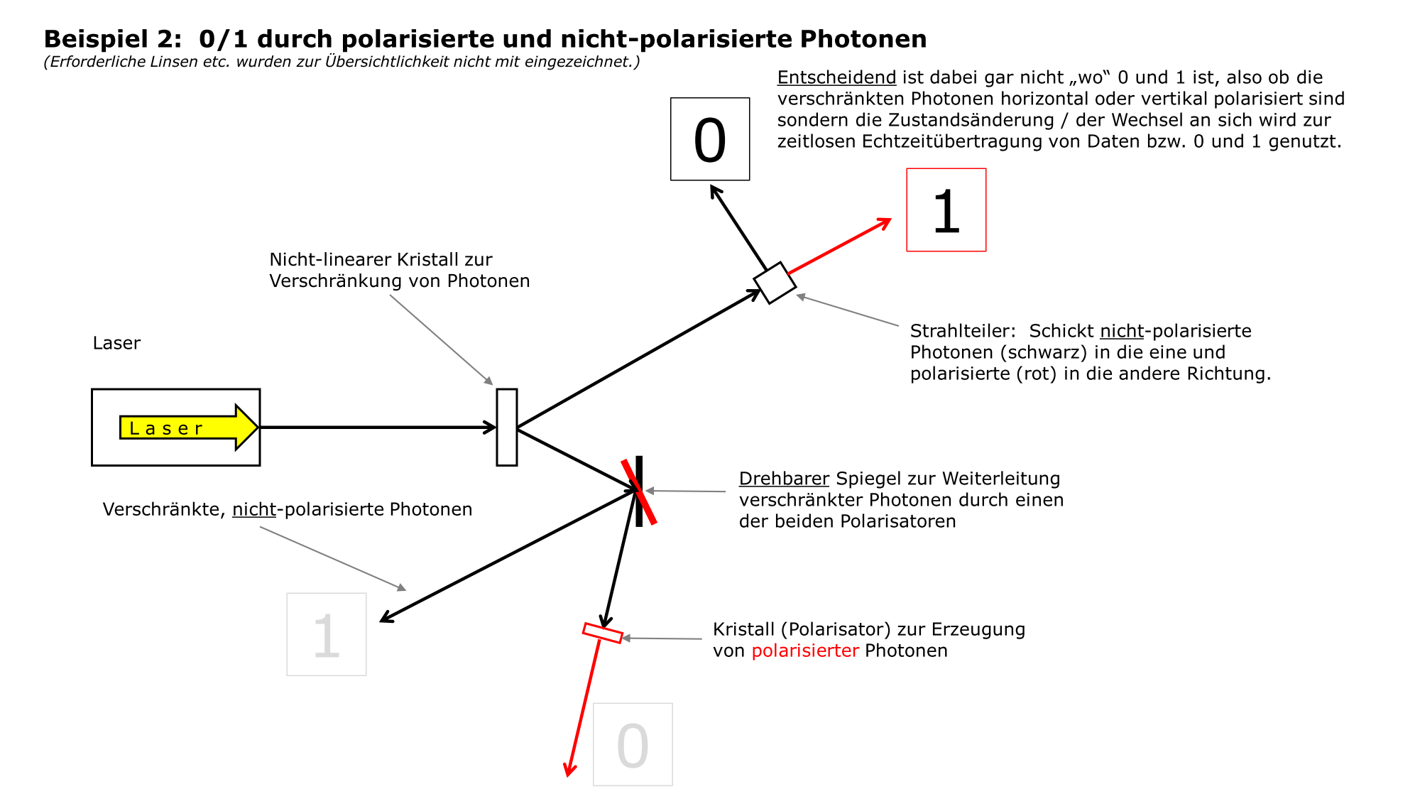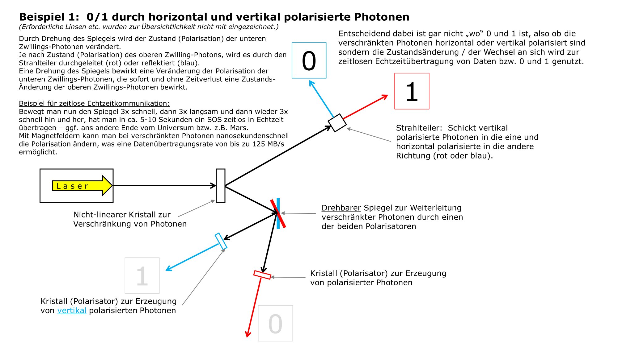durch Polarisation und Nicht-Polarisation verschränkter Photonen Daten zu übertragen. Diese Methode der Datenübertragung wird Quantenkommunikation genannt.